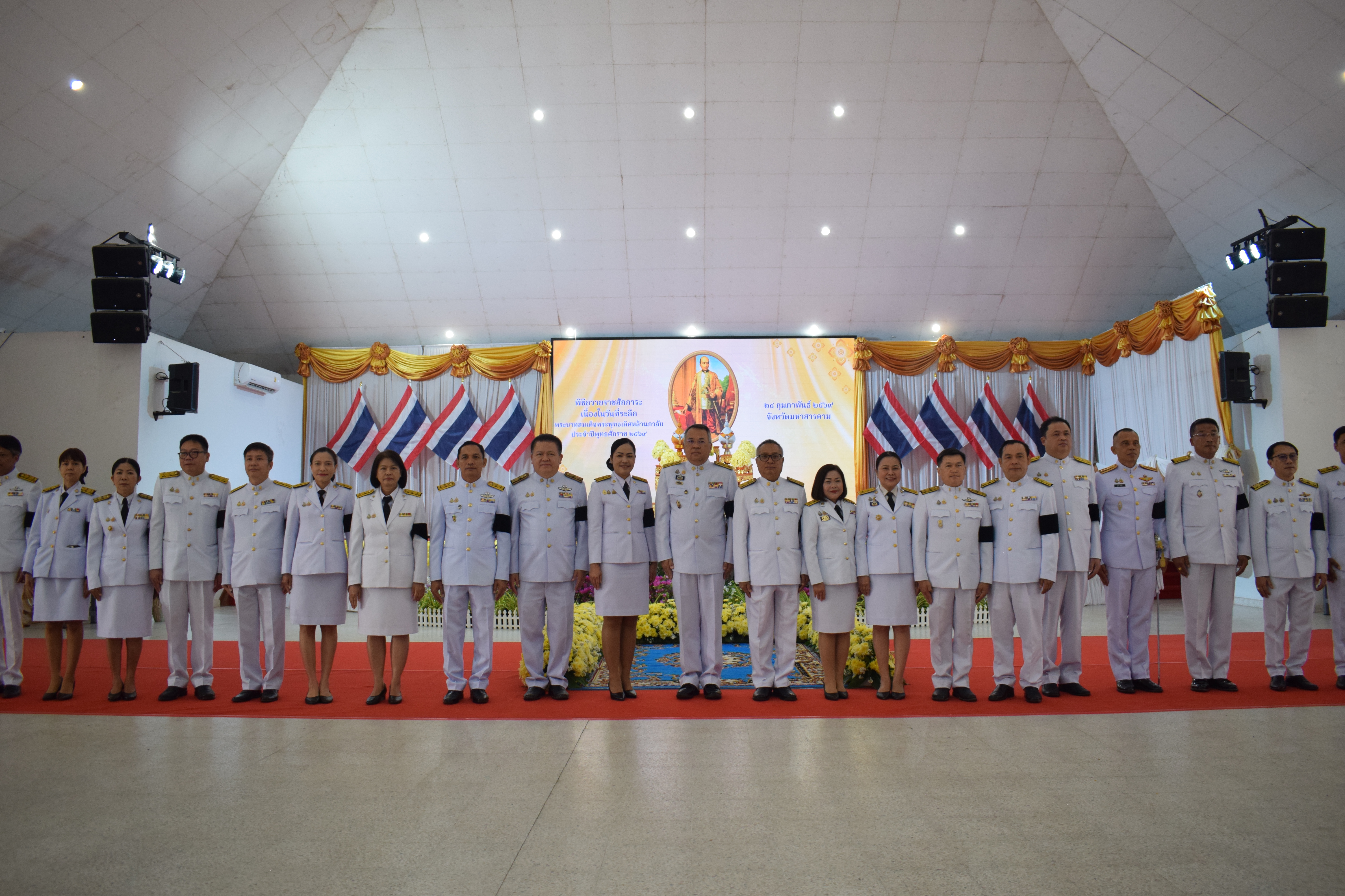 วันอังคารที่ 24 กุมภาพันธ์ 2569 นายศิวะ โพธิตาปนะ อุตสาหกรรมจังหวัดมหาสารคาม เข้าร่วมพิธีวางพานพุ่มดอกไม้ถวายราชสักการะเนื่องในวันคล้ายวันพระบรมราชสมภพ พระบาทสมเด็จพระพุทธเลิศหล้านภาลัย ประจำปี พ.ศ. 2569 เพื่อเป็นการน้อมรำลึกถึงพระมหากรุณาธิคุณอันยิ่งใหญ่ในด้านงานศิลปวัฒนธรรมของชาติ ณ หอประชุมสุริยะจันทร์ วิทยาลัยเทคนิคมหาสารคาม ตำบลตลาด อำเภอเมืองมหาสารคาม จังหวัดมหาสารคาม โดยมี นายชุมพิชญ์ เดชะรัฐ ผู้ว่าราชการจังหวัดมหาสารคาม เป็นประธานในพิธี พร้อมด้วย หัวหน้าส่วนราชการ อัยการ ศาล ทหาร ตำรวจ และพสกนิกรทุกหมู่เหล่า เข้าร่วมพิธี